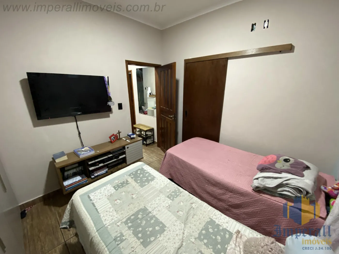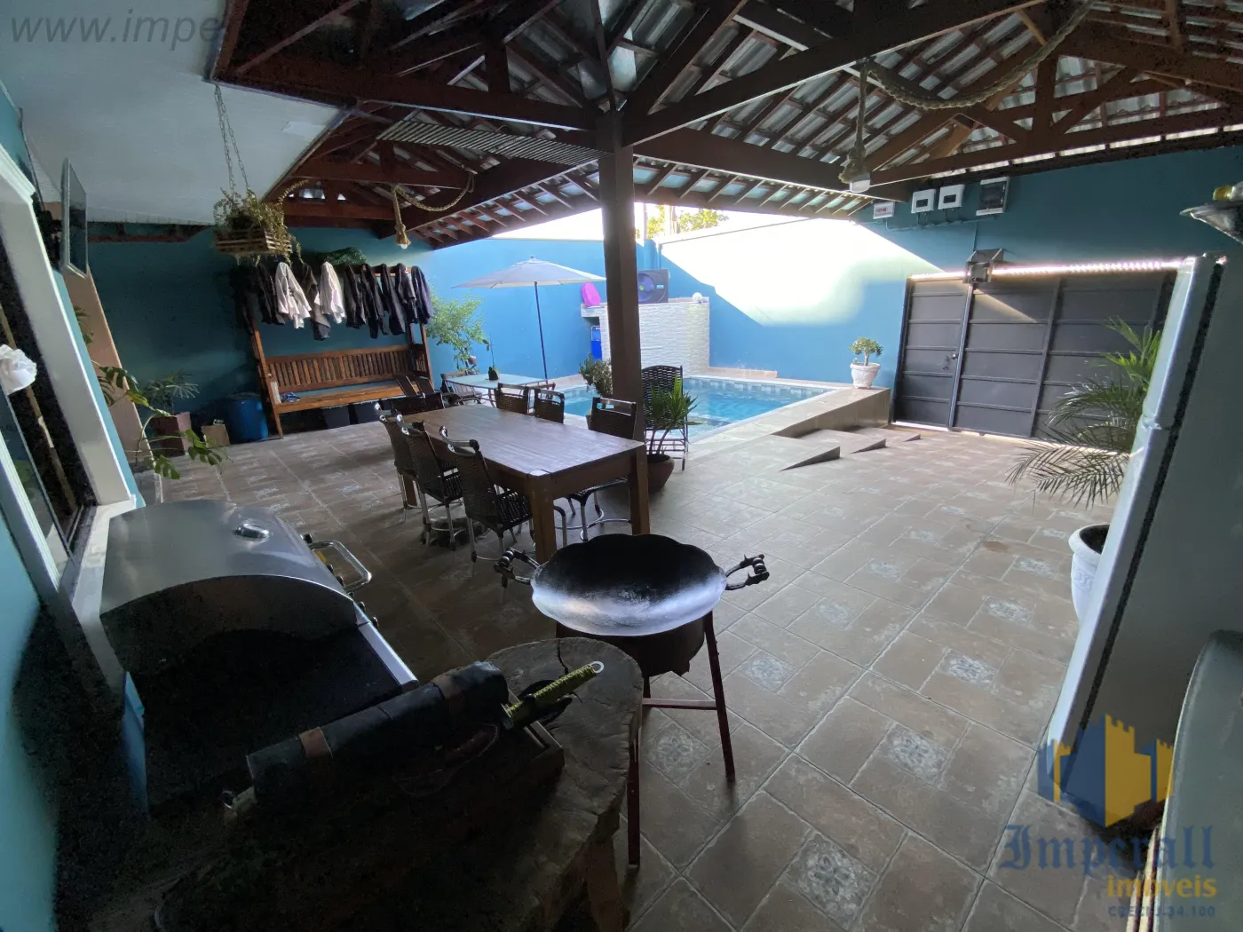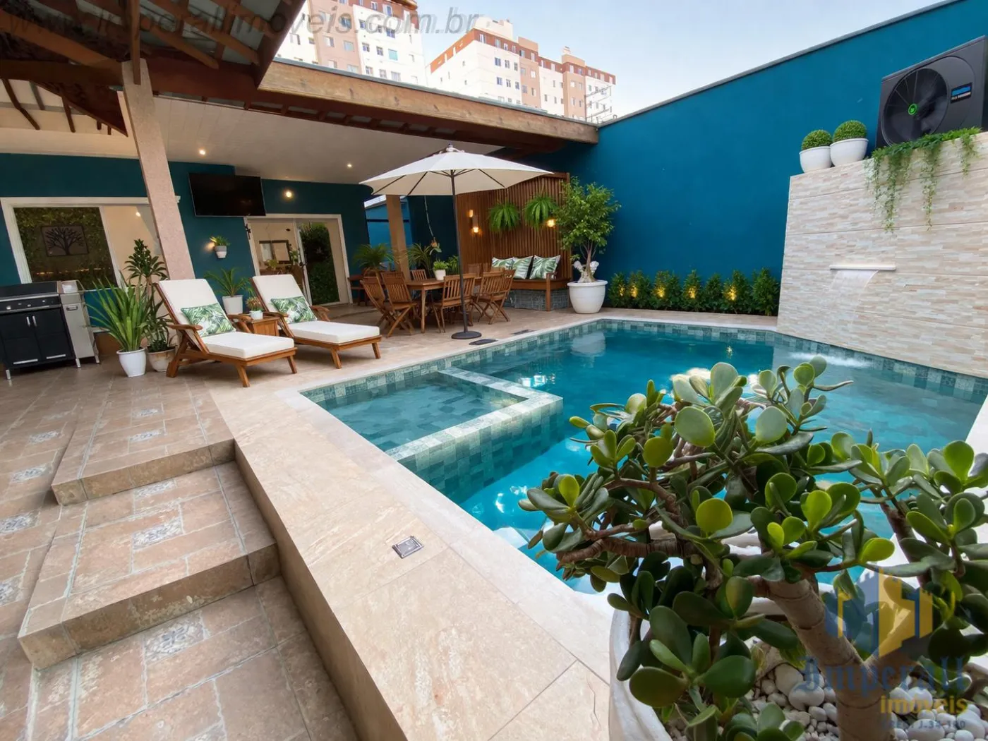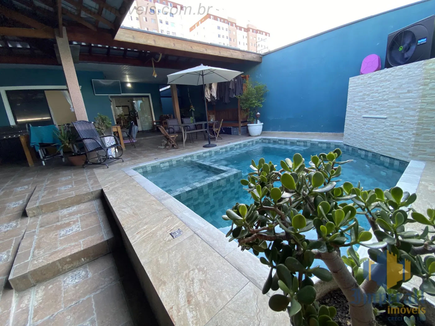 São 3 dormitórios sendo 1 suíte e 1 suíte master com hidromassagem e varanda, sala de estar, sala de tv, cozinha com armários, escritório, garagem para 2 carros, piscina com aquecedor recém construída.