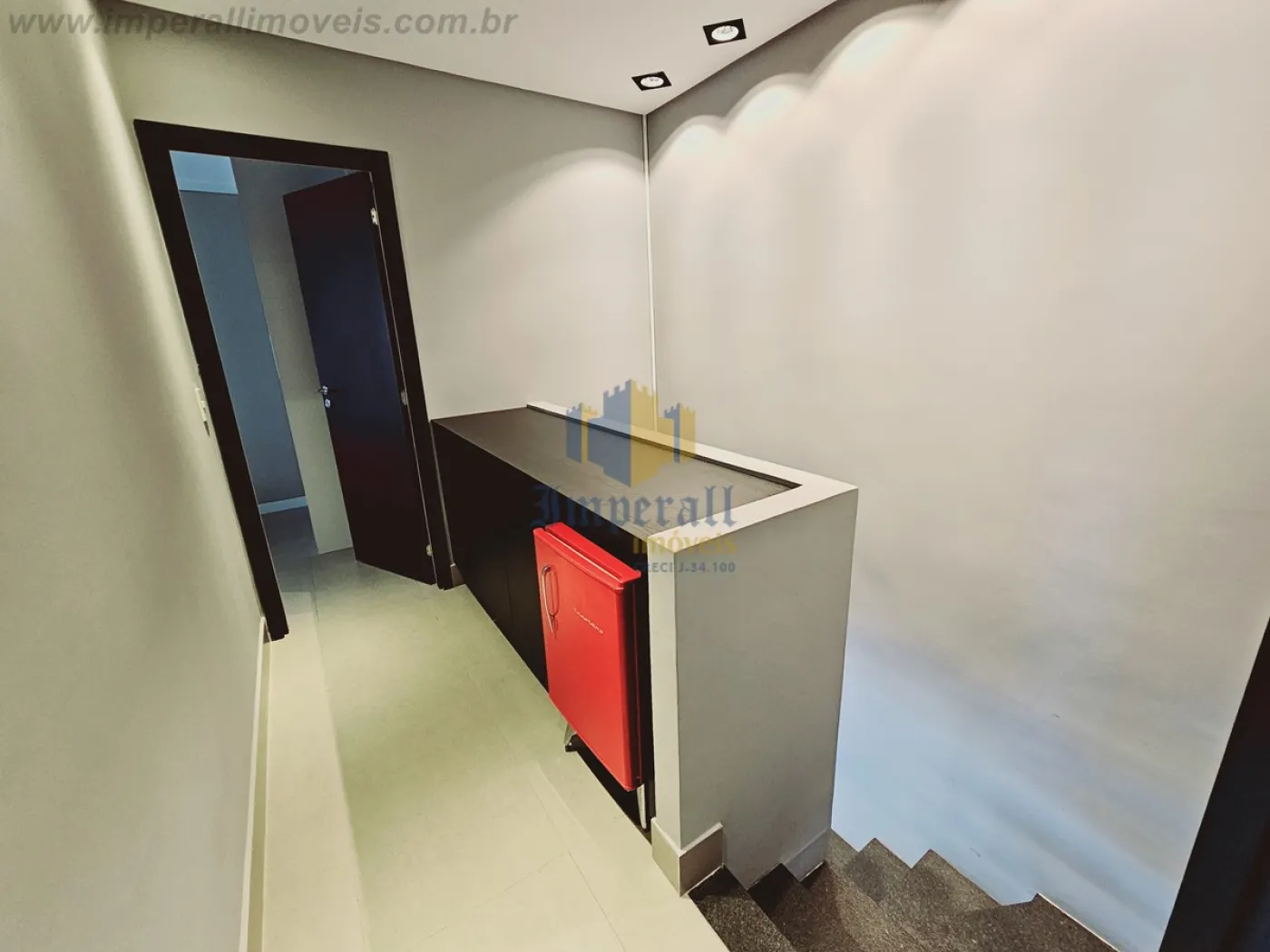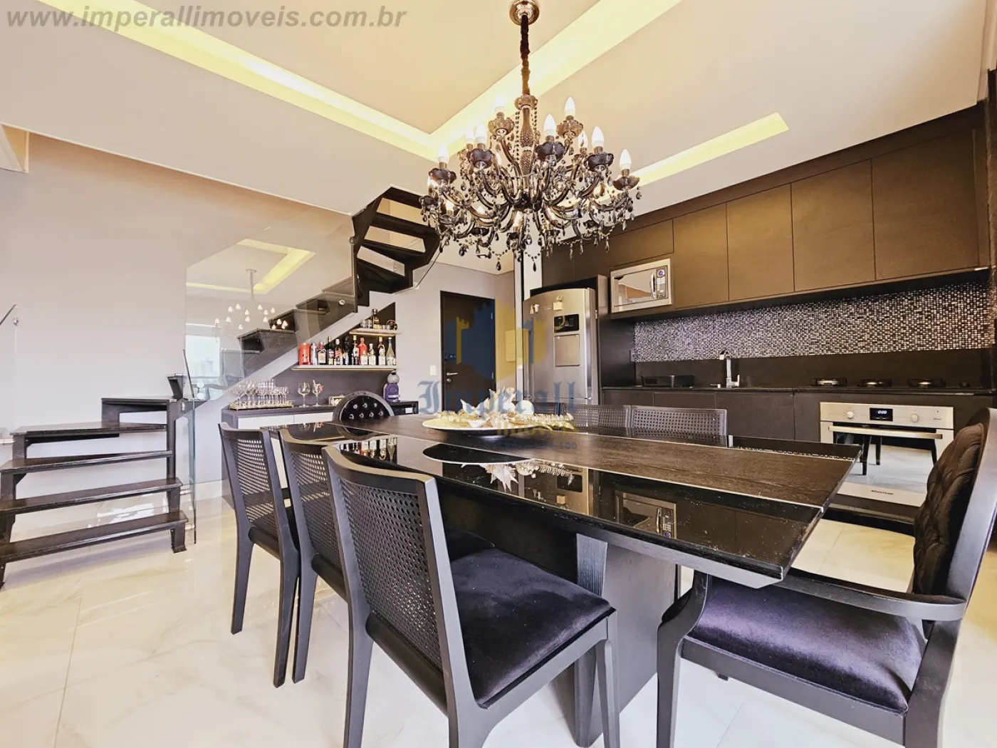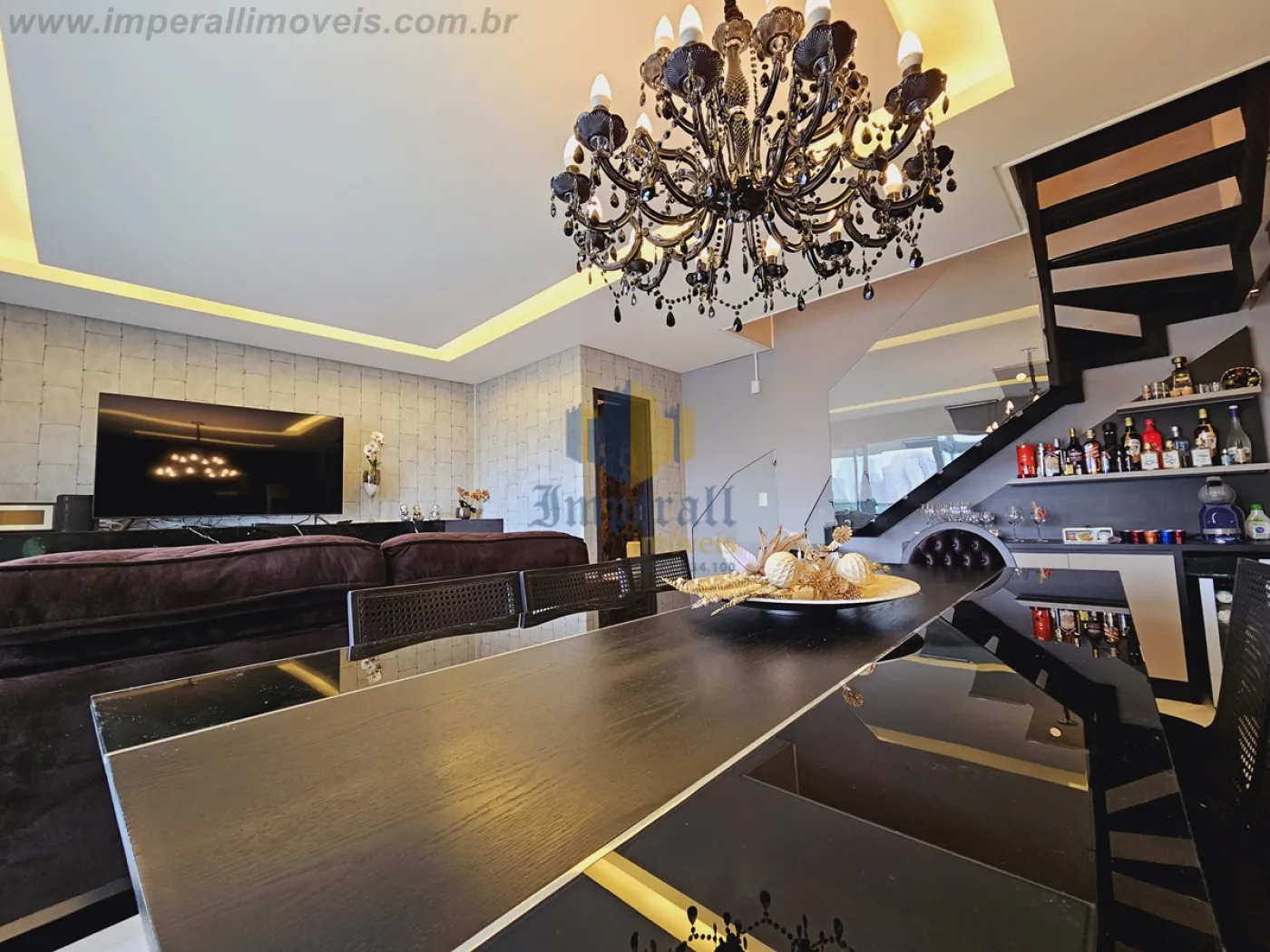 O piso inferior é muito bem modelado em ambientes harmônicos e integrados. Sala de 3 ambientes, piso porcelanato de alto padrão, cozinha repleta de armários e eletrodomésticos embutidos, área de serviço já com aparelho de aquecimento à gás instalado, teto rebaixado, iluminação inteira planejada, lavabo e uma linda varanda com lareira e já com fechamento de vidro e cortinas rolon instaladas.