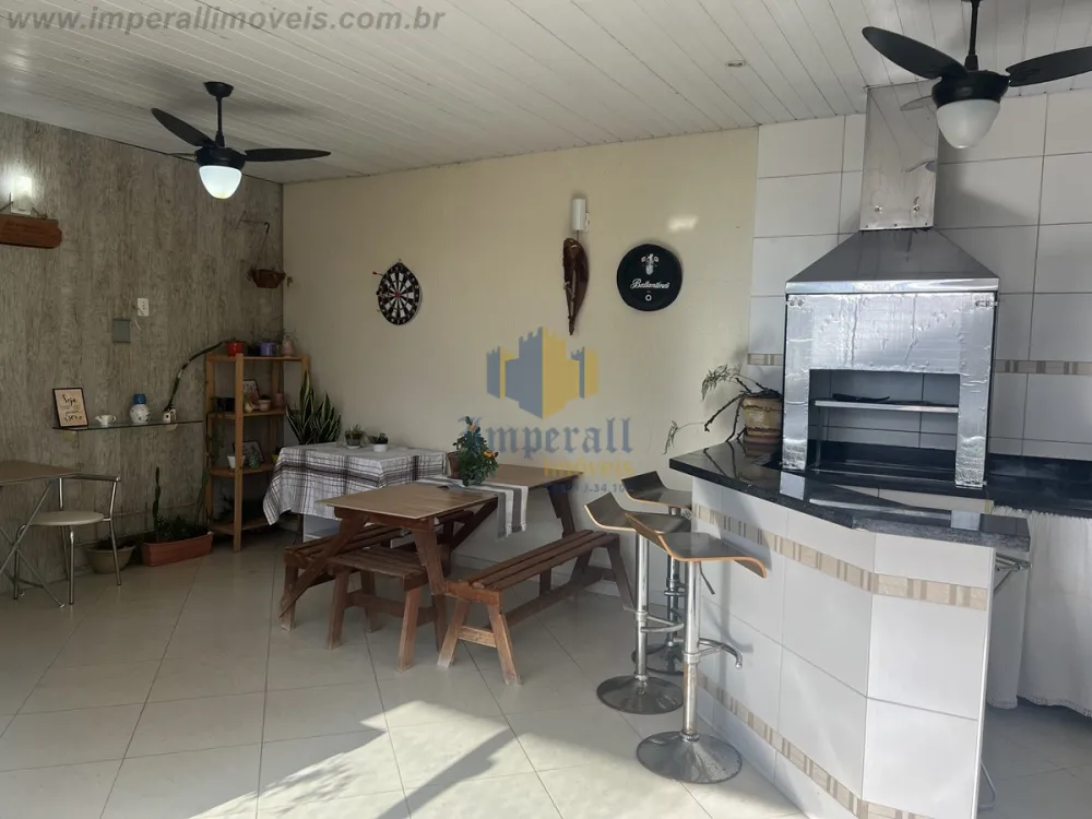 Piso superior: suíte do casal com sacada, ampla área de serviço e área gourmet com churrasqueira.