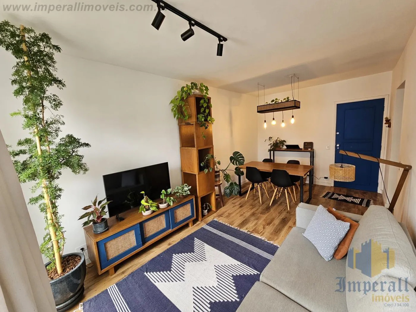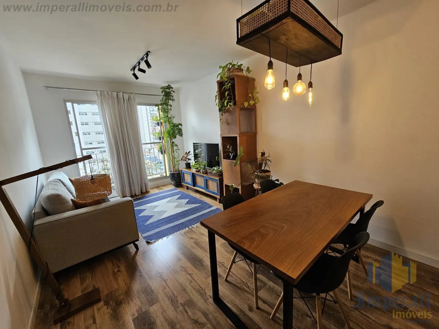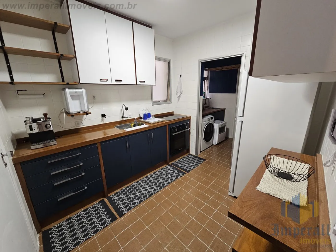 O imóvel dispõe de dois quartos, sendo um deles equipado com guarda-roupa planejado, mesas de cabeceira e cama padrão hotelaria, enquanto o segundo ambiente é atualmente utilizado como escritório, contando com iluminação planejada. Possui dois banheiros, sendo um amplo, com móveis planejados, e outro configurado como lavabo. A sala é ampla e bem distribuída, composta por mesa de jantar, aparador, rack e estante confeccionados em madeira de lei Cumaru, além de sofá e televisão LG, proporcionando sofisticação e conforto. A cozinha é espaçosa, com móveis planejados, pia em Cumaru em excelente estado, cooktop, forno elétrico, geladeira Brastemp e espaço para mesa, ideal para o dia a dia. Conta ainda com lavanderia funcional, equipada com bancada em Cumaru, móvel planejado, lava e seca LG e lava-louças Brastemp.