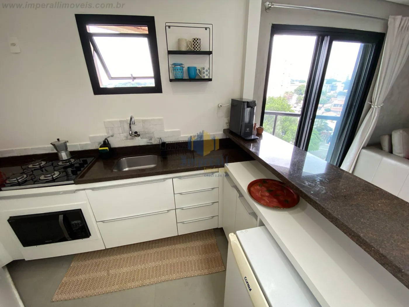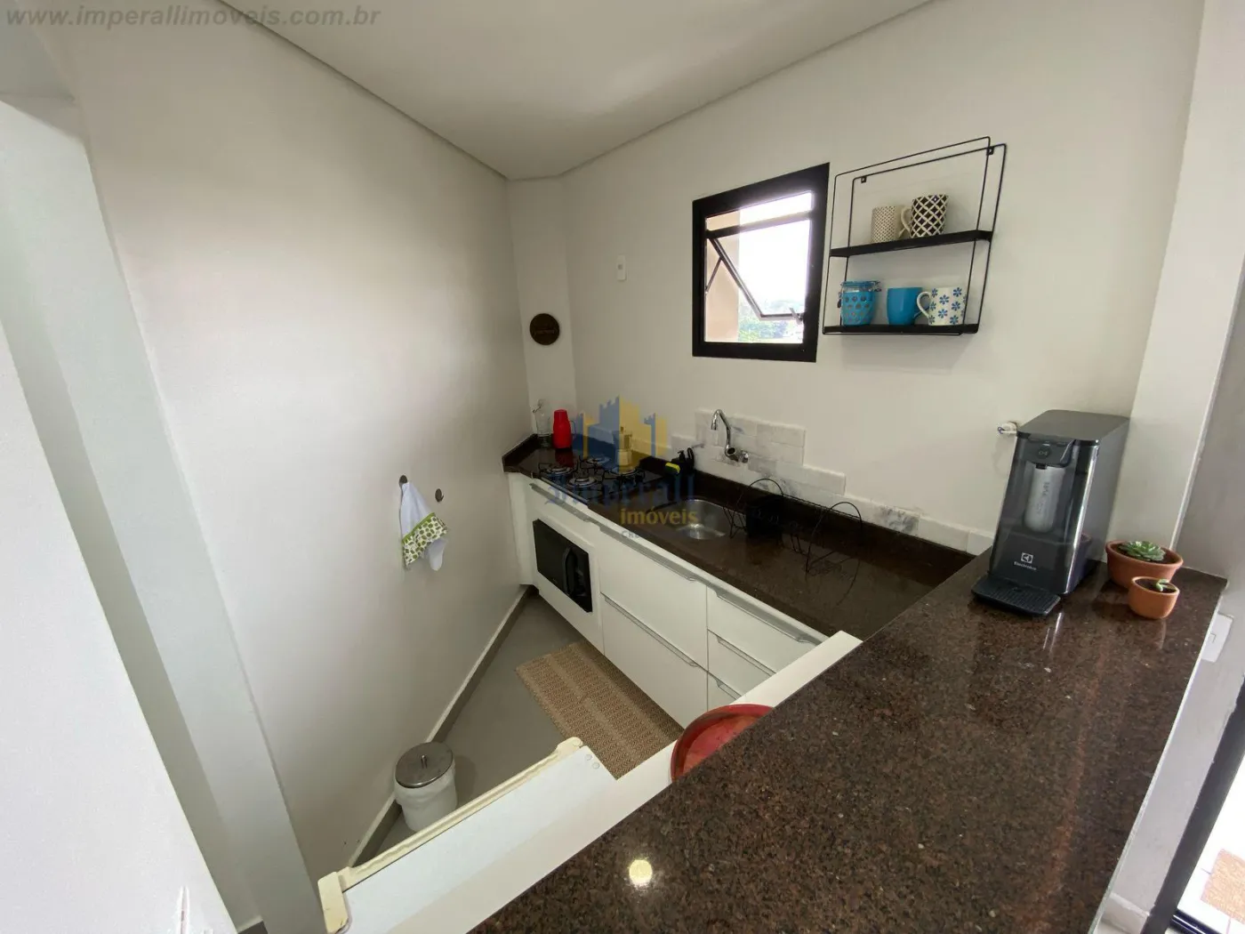 Apartamento Flat no coração de São José dos Campos, sendo 1 dormitório com armários e varanda, cozinha com armários planejados e forno, sala de estar com varanda.