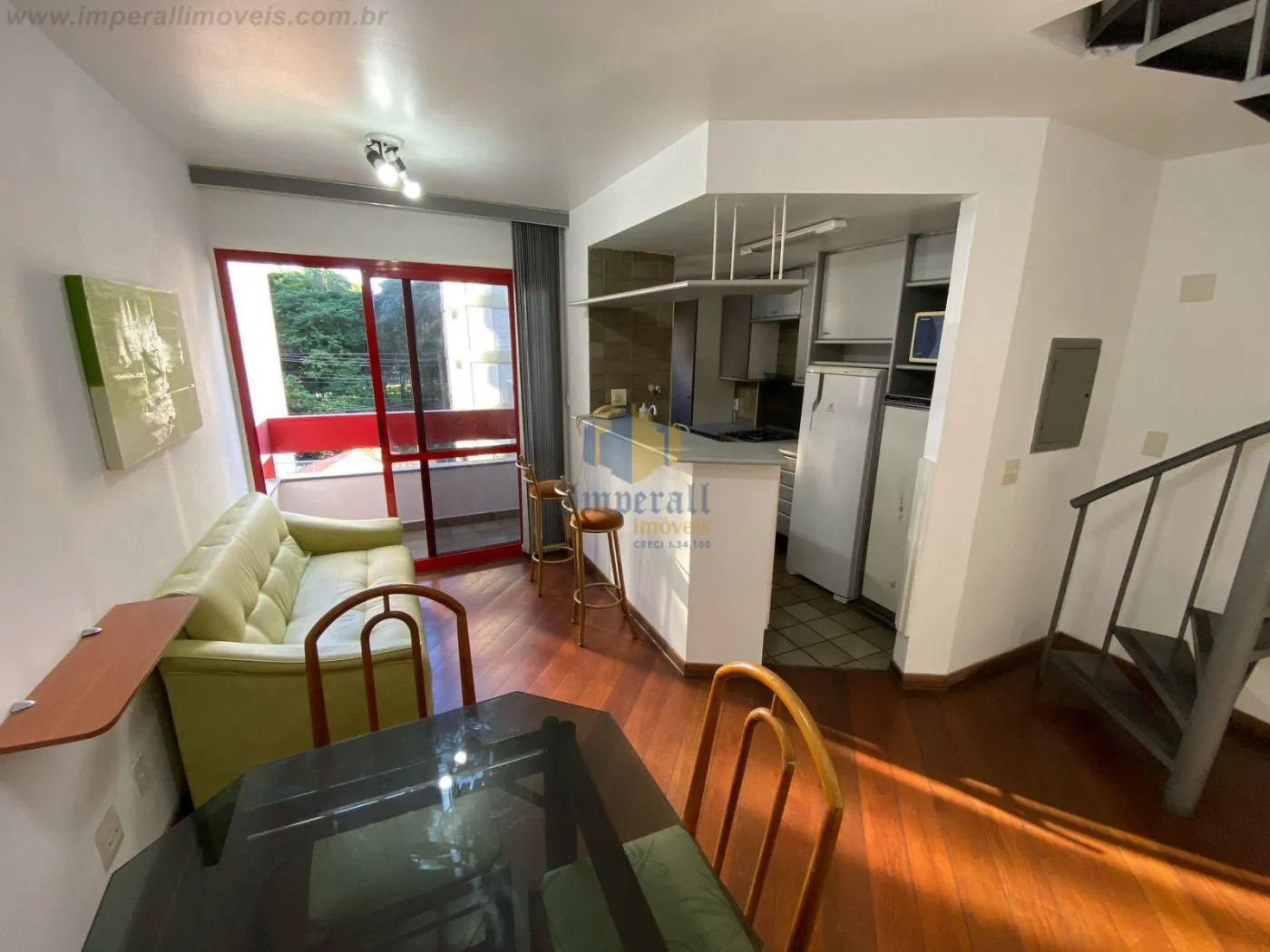 Apartamento Flat Duplex sendo 1 suíte com armários planejados, sala de tv de 2 ambientes, varanda, cozinha planejada e área de serviços.