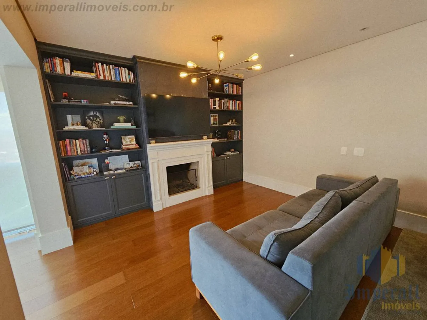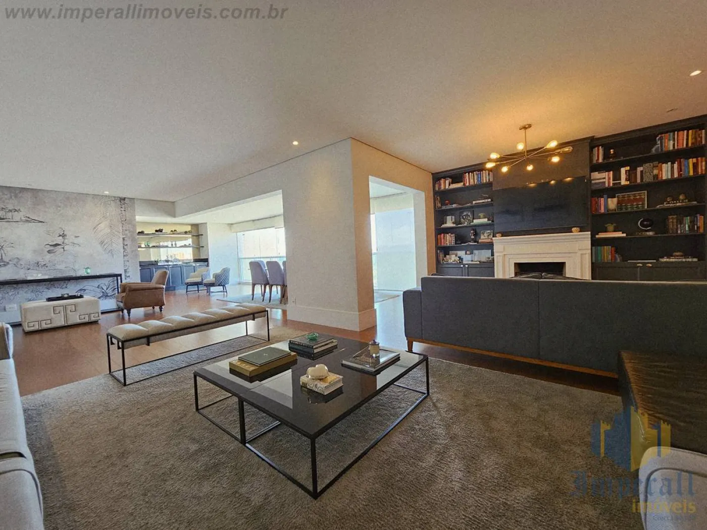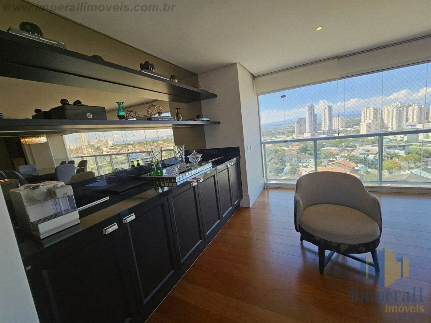 Sala amplíssima com sacada estendida e fechamento em cortina de vidro. Piso de madeira da conceituada Triângulo que adiciona elegância e conforto térmico ao ambiente. Biblioteca junto à lareira com TV, contando com o refinamento da marcenaria Florense sob medida na cor chumbo. Bar com marcenaria Florense sob medida em elegante cor carbono com espelhos bronze, também servindo de aparador em almoços e jantares. A churrasqueira foi retirada, sendo totalmente reversível (exaustão fechada com gesso). Mesa de jantar com 8 lugares em cristal e madeira, da marca BRETON. Sofá em L com 10 lugares todo em módulos com pufe de couro preto, também da marca BRETON. Tapetes sob medida da Mobile Top Prime. Lustres da biblioteca, sala de jantar (cristal) e hall (cristal) da tradicional Lustreco (SP). Hall privativo com espelhos bronze bisotados, fechadura eletrônica e elevador com senha para maior segurança. Cozinha ampla com marcenaria Florense na cor chumbo e bancada em Silestone Cosentino. Eletrodomésticos Elettromec (forno elétrico com convecção, cooktop e microondas). Suíte do casal amplíssima com closet Florense (uma suíte foi transformada em closet, sendo totalmente reversível). Área de serviço com armários. Despensa com prateleiras. Hobby box amplo com prateleiras.