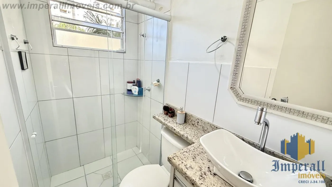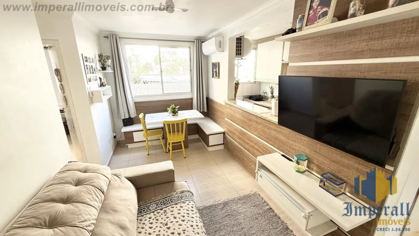 Excelente apartamento de 45 m², dividido em Sala repleta de planejados incluindo canto alemão com mesa e ar condicionado, 2 Quartos sendo 1 planejado, Banheiro social com box e armários, Cozinha toda planejada com cooktop e forno, e Área de serviço.