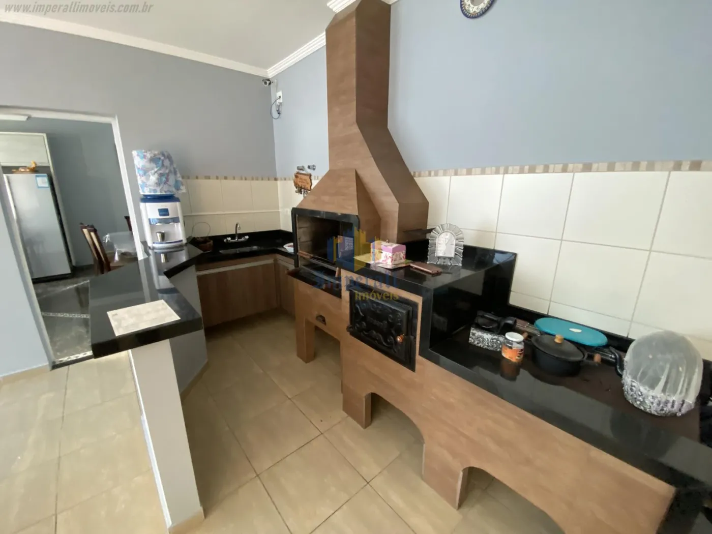 A cozinha fica nos fundos, separada da casa principal e ao lado fica a área gourmet com churrasqueira e fogão à