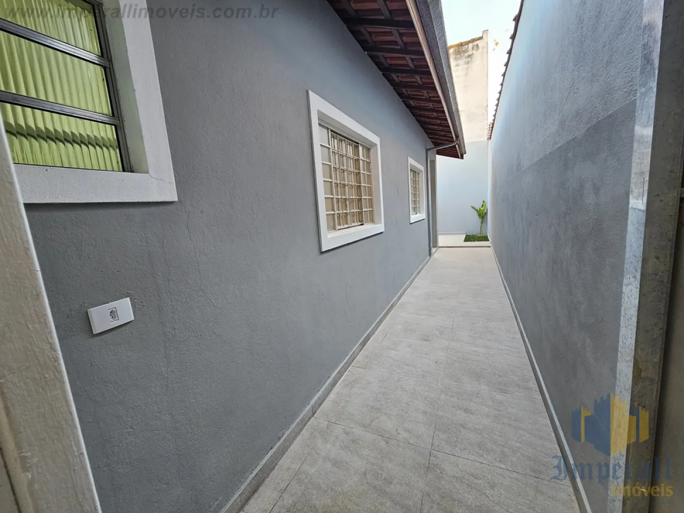Casa térrea no bairro Bosque dos Ipês Sjc com 3 dormitórios sendo 1 suíte, sala de 2 ambientes, cozinha americana, banheiro social, vaga coberta para 2 carros, piso cerâmico, corredor lateral e quintal com churrasqueira.